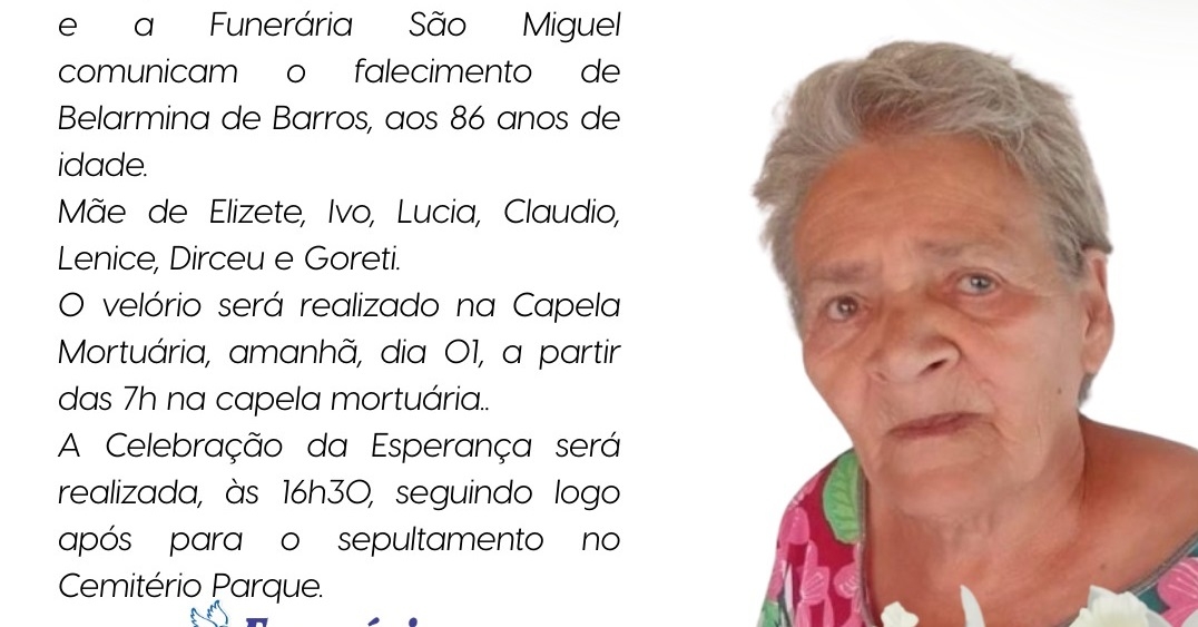 O Plano Safisul e a Funerária São Miguel comunicam o falecimento de Belarmina de Barros