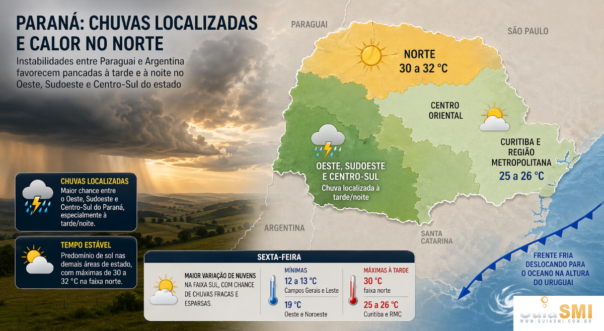Frente fria no oceano mantém chance de chuvas localizadas no Oeste do Paraná