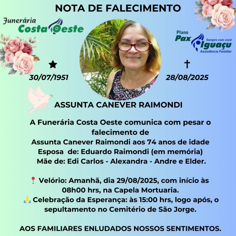 A Funerária Costa Oeste comunica com profundo pesar o falecimento de Assunta Canever Raimondi, ocorrido ontem, dia 28 de agosto de 2025, aos 74 anos de idade. Esposa de Eduardo Raimondi (em memória), Assunta deixa os filhos Edi Carlos, Alexandra, Andre e Elder, além de familiares e amigos que hoje se reúnem em despedida.