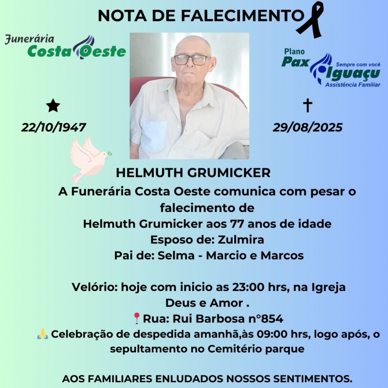 A Funerária Costa Oeste comunica com pesar o falecimento de Helmuth Grumicke, ocorrido ontem, 29 de agosto de 2025, aos 77 anos de idade. Esposo de Zulmira e pai de Selma, Márcio e Marcos, deixa lembranças de dedicação e amor à família.