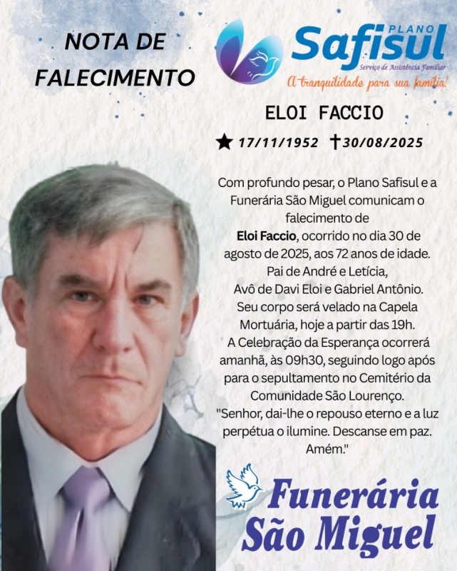 Com profundo pesar, o Plano Safisul e a Funerária São Miguel comunicam o falecimento de Eloi Faccio, ocorrido neste sábado, 30 de agosto de 2025, aos 72 anos de idade.