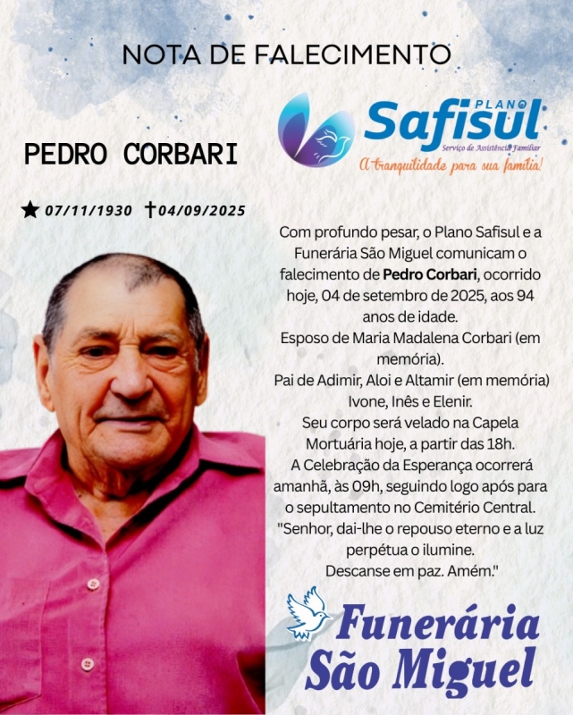 Com profundo pesar, o Plano Safisul e a Funerária São Miguel comunicam o falecimento de Pedro Corbari, ocorrido nesta quinta-feira, 04 de setembro de 2025, aos 94 anos de idade.