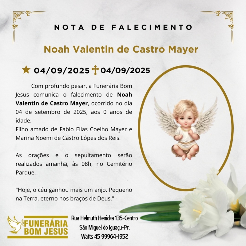 É com grande pesar que a Funerária Bom Jesus comunica o falecimento de Noah Valentin de Castro Mayer, ocorrido ontem, 04 de setembro de 2025, aos 0 anos de idade.