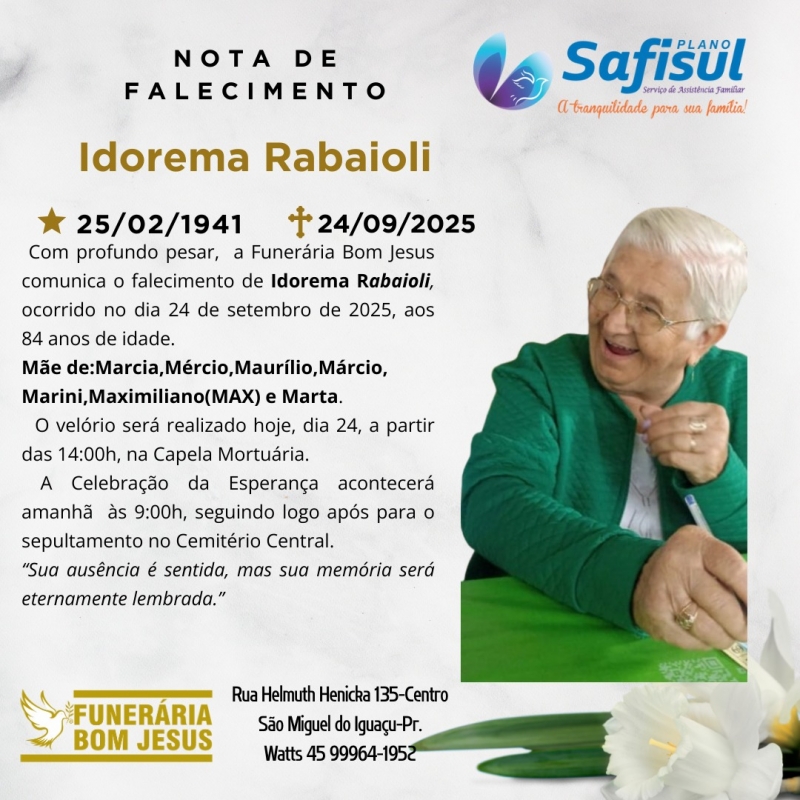 É com profundo pesar que a Funerária Bom Jesus comunica o falecimento de Idorema Rabaioli, ocorrido nesta quarta-feira, 24 de setembro de 2025, aos 84 anos de idade.