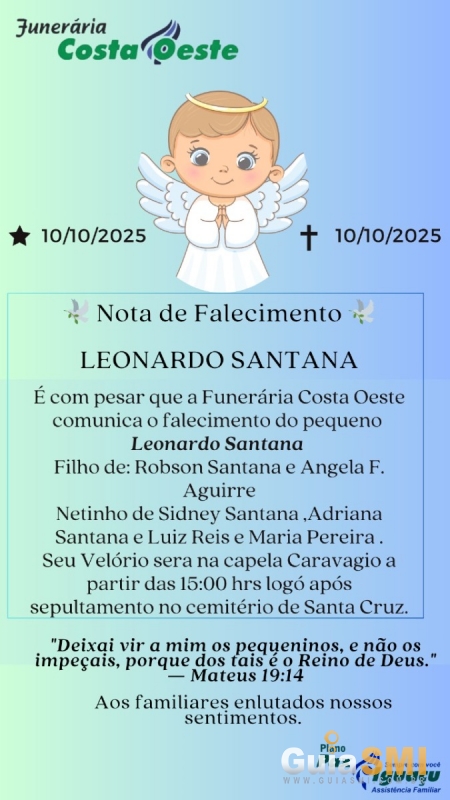 É com profundo pesar que a Funerária Costa Oeste comunica o falecimento do pequeno Leonardo Santana, ocorrido na quinta-feira, dia 10 de outubro de 2025.