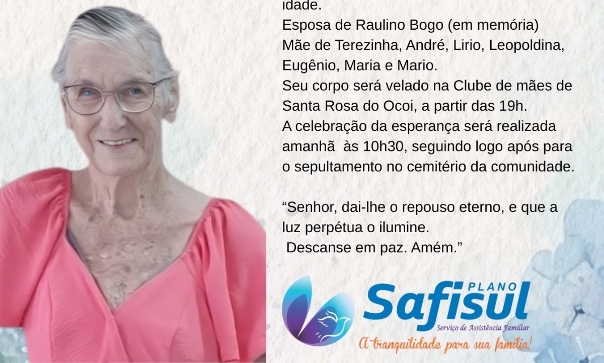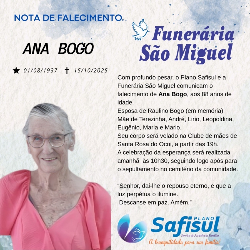 Com profundo pesar, o Plano Safisul e a Funerária São Miguel comunicam o falecimento de Ana Bogo, ocorrido nesta quarta-feira, 15 de outubro de 2025, aos 88 anos de idade.