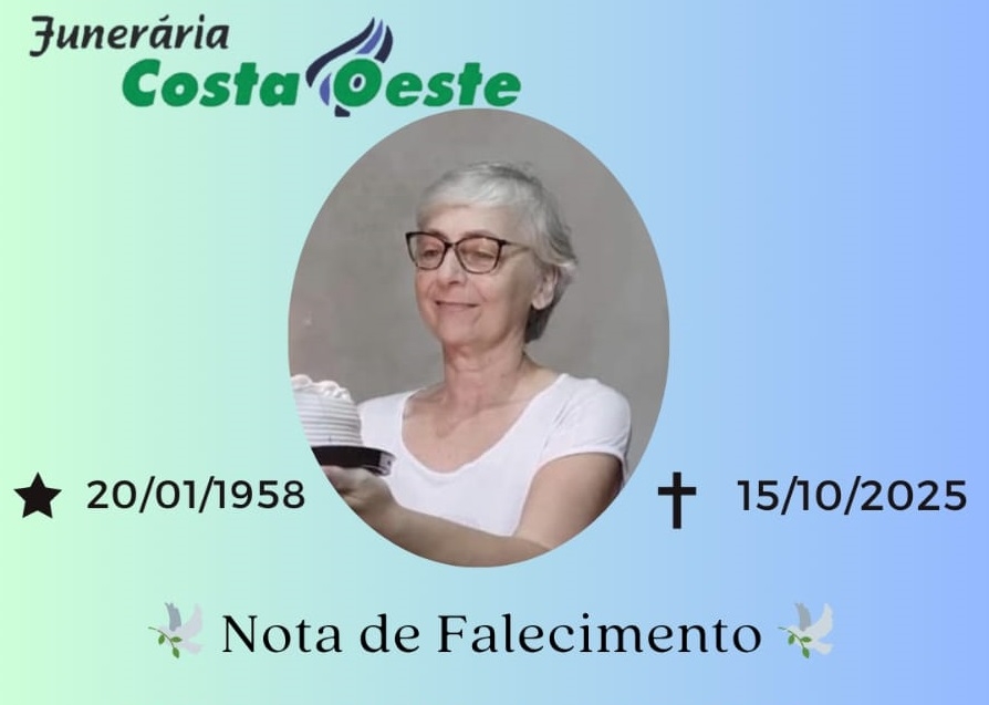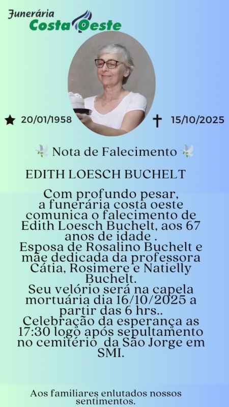Com profundo pesar, a Funerária Costa Oeste comunica o falecimento de Edith Loesch Buchelt, ocorrido na última quarta-feira, 15 de outubro de 2025, aos 67 anos de idade.
