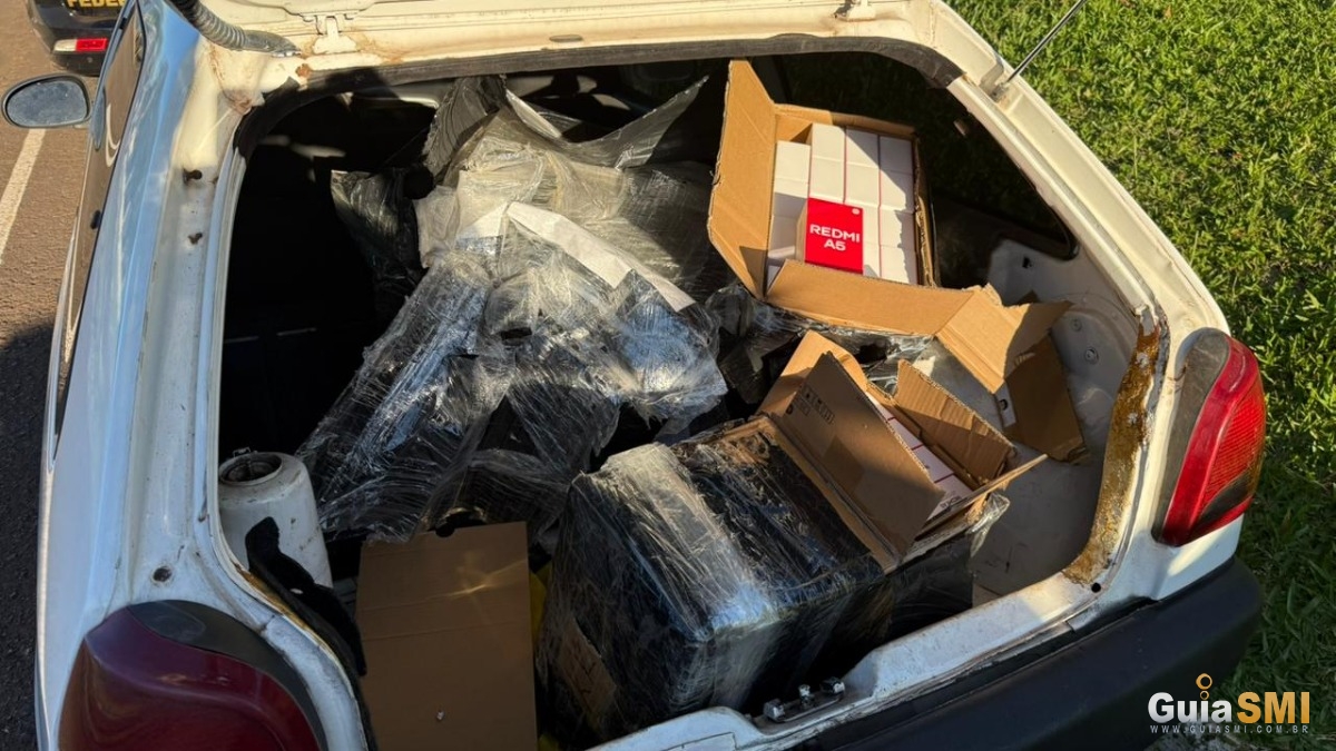 No interior do veículo e da residência foram encontrados oito fardos contendo celulares, computadores da marca Apple e equipamentos de laser para estética, além de uma pistola calibre 9mm com dois carregadores e 29 munições.