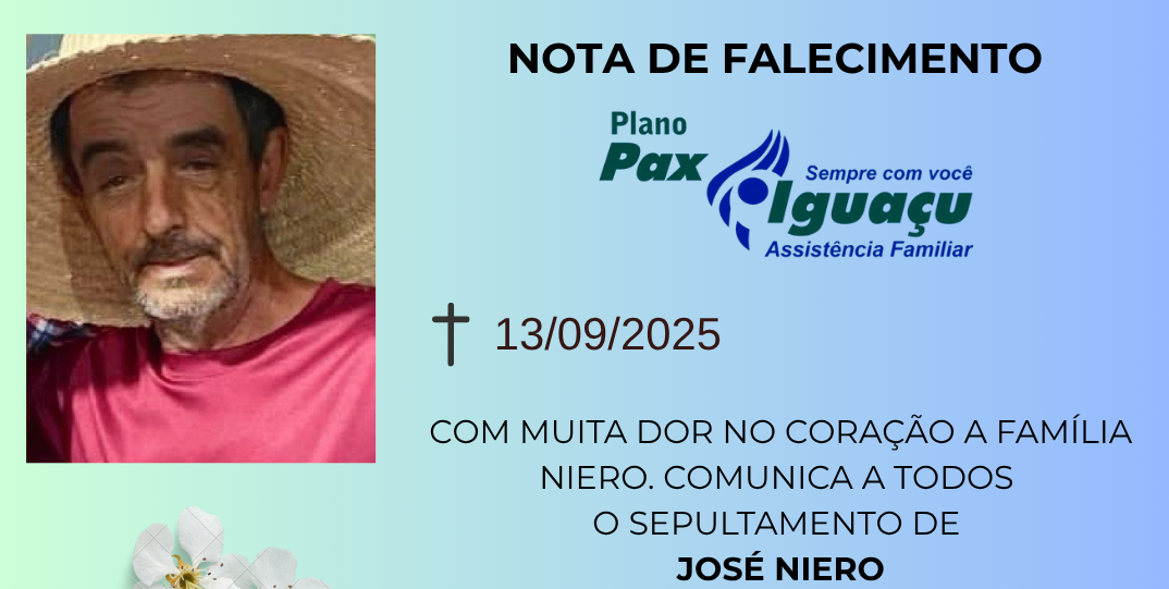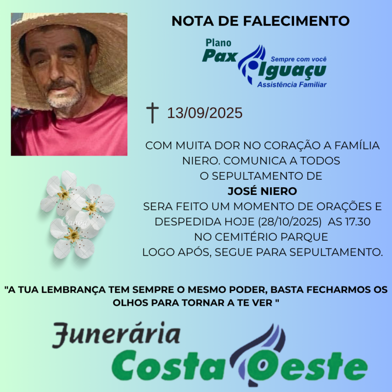 Com profundo pesar, a Família Niero e a Funerária Costa Oeste comunicam o sepultamento de José Niero que faleceu no dia 13 de setembro de 2025.