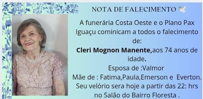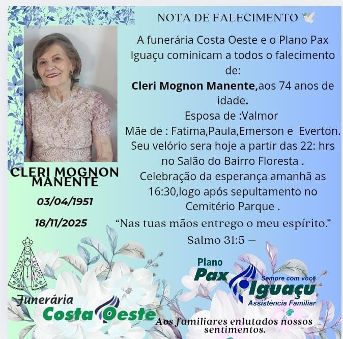 A Funerária Costa Oeste e o Plano Pax Iguaçu comunicam, com profundo pesar, o falecimento de Cleri Mognon Manente, ocorrido nesta terça-feira, 18 de novembro de 2025, aos 74 anos.