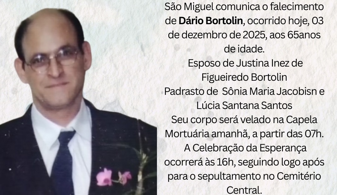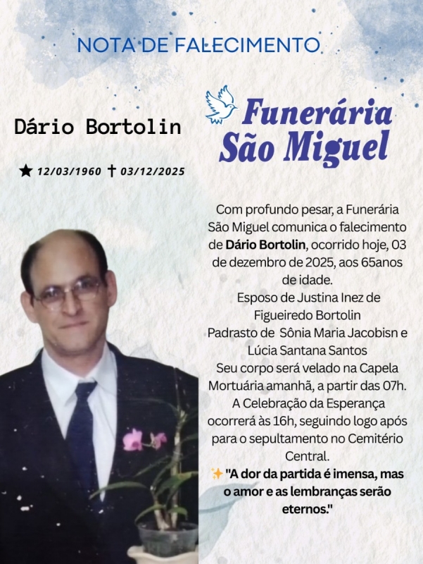Com profundo pesar, a Funerária São Miguel comunica o falecimento de Dário Bortolin, ocorrido ontem, 03 de dezembro de 2025, aos 65 anos. Morador estimado na comunidade, Dário deixa a esposa Justina Inez Figueiredo Bortolin e as enteadas Sônia Maria Facobisn e Lúcia Santana Santos, que agora enfrentam este momento de dor e despedida.