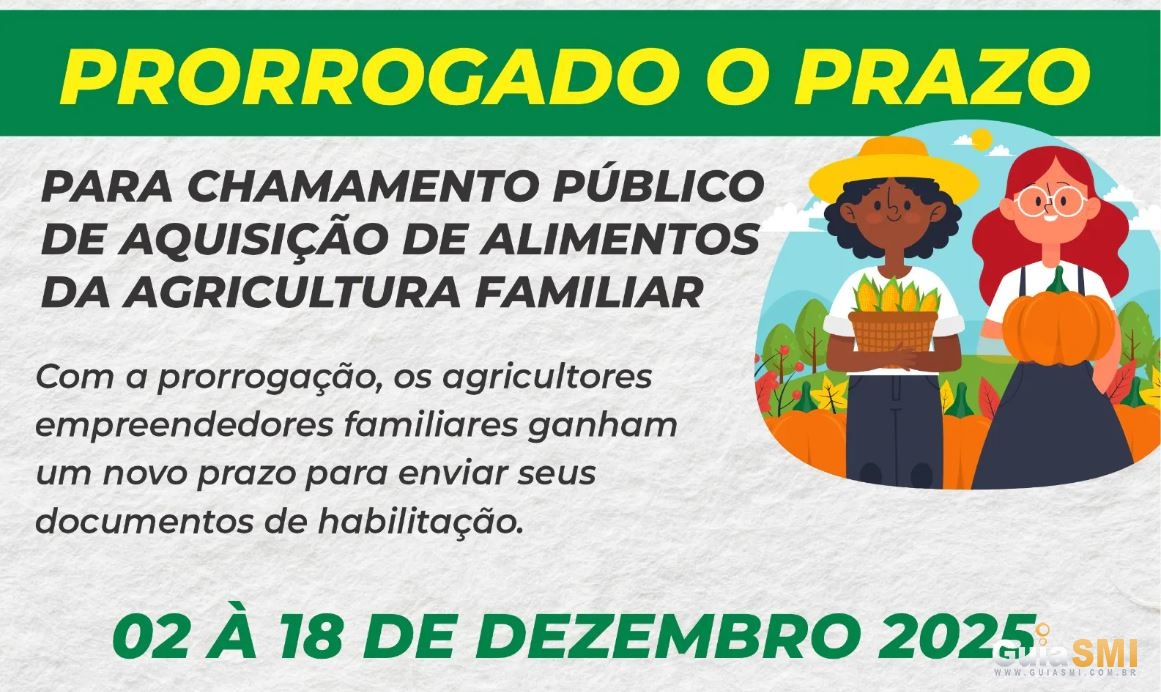 O Governo Municipal de São Miguel do Iguaçu, por meio da Secretaria Municipal de Educação, informa que foi prorrogado o prazo da Chamada Pública nº 001/2025, destinada à aquisição de gêneros alimentícios provenientes da Agricultura Familiar e do Empreendedor Familiar Rural para a alimentação escolar dos alunos da Rede Municipal de Ensino.