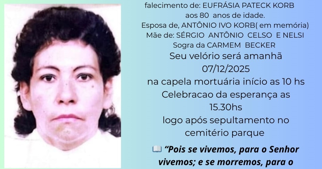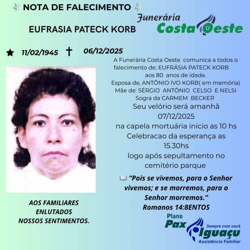 A Funerária Costa Oeste comunica, com pesar, o falecimento de Eufrásia Pateck Korb, ocorrido neste sábado, 06 de dezembro de 2025, aos 80 anos de idade.