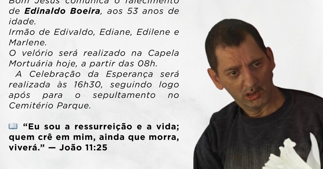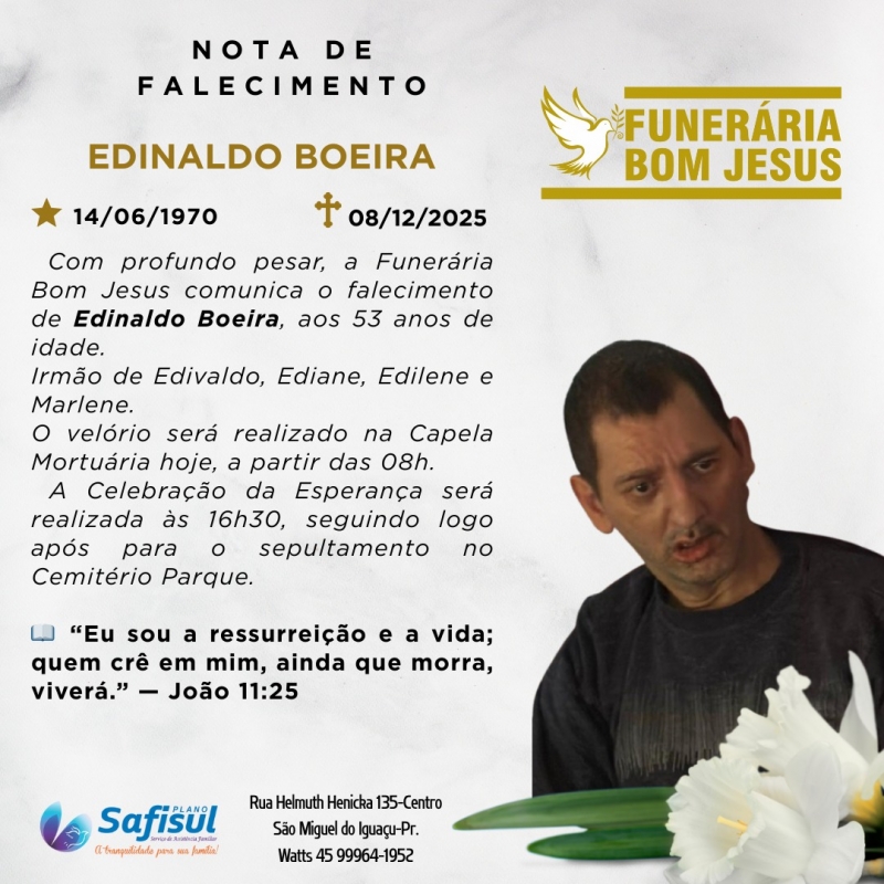 A Funerária Bom Jesus comunica, com profundo pesar, o falecimento de Edinaldo Boeira, ocorrido nesta segunda, 08 de dezembro de 2025, aos 53 anos de idade.