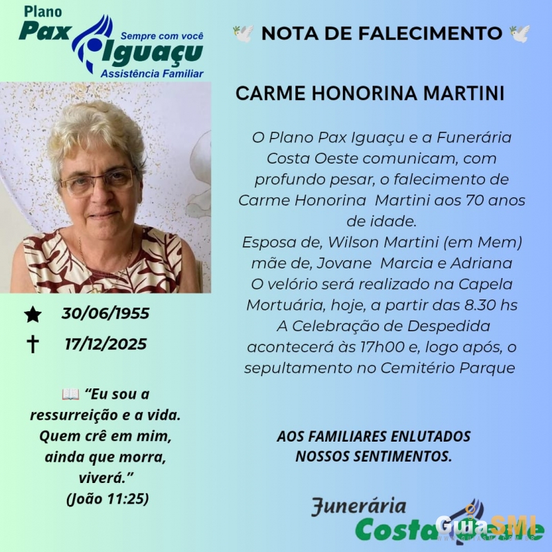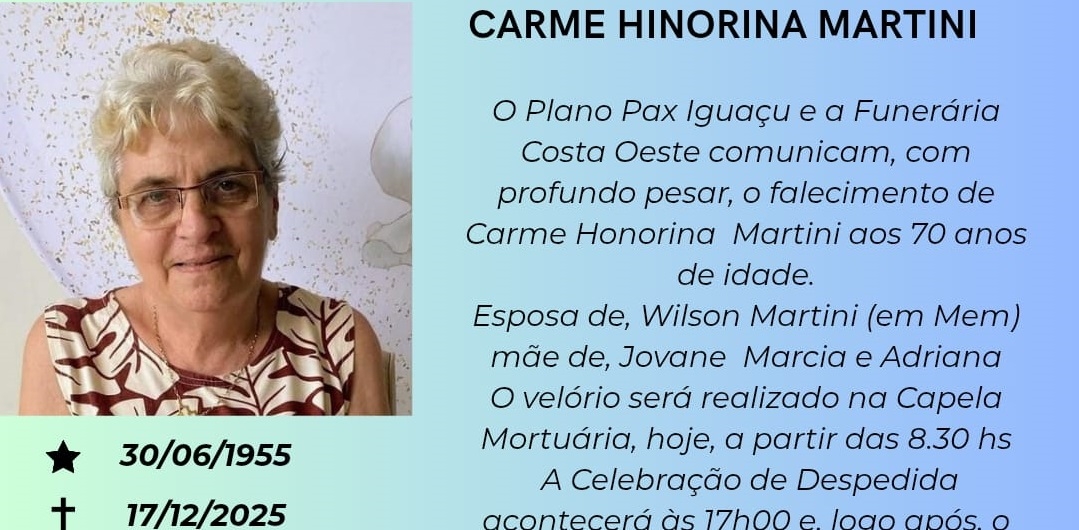 O Plano Pax Iguaçu e a Funerária Costa Oeste comunicam, com profundo pesar, o falecimento de Carme Honorina Martini, ocorrido nesta quarta-feira, 17 de dezembro de 2025, aos 70 anos de idade.