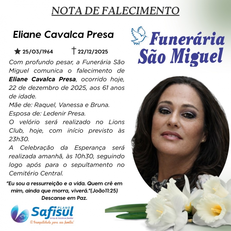 Com profundo pesar, a Funerária São Miguel comunica o falecimento de Eliane Cavalca Presa, ocorrido nesta segunda-feira, 22 de dezembro de 2025, aos 61 anos de idade.