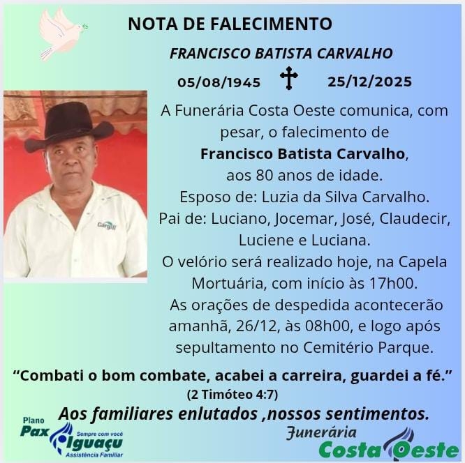 A Funerária Costa Oeste comunica, com pesar, o falecimento de Francisco Batista Carvalho, ocorrido nesta quinta-feira, 25 de dezembro de 2025, aos 80 anos de idade.