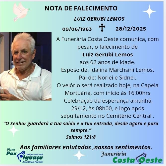 A Funerária Costa Oeste comunica, com profundo pesar, o falecimento de Luiz Gerubi Lemos, ocorrido neste domingo, 28 de dezembro de 2025, aos 62 anos de idade.