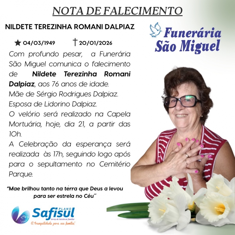 A Funerária São Miguel comunica, com profundo pesar, o falecimento de Nildete Terezinha Romani Dalpiaz, ocorrido ontem, 20 de janeiro de 2026, aos 76 anos de idade.