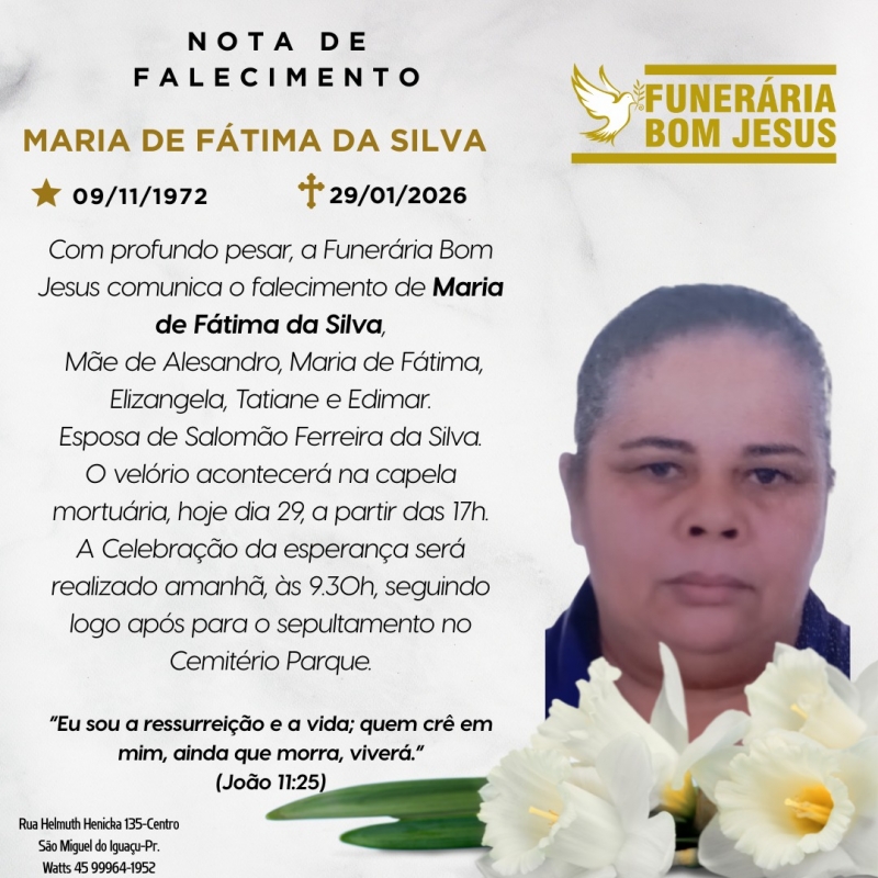Com profundo pesar, a Funerária Bom Jesus comunica o falecimento de Maria de Fátima da Silva, ocorrido nesta quinta-feira, 29 de janeiro de 2026, aos 53 anos de idade.
