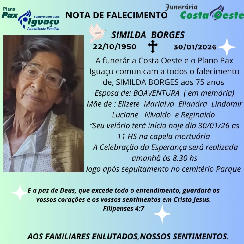 A Funerária Costa Oeste, em conjunto com o Plano Pax Iguaçu, comunicam com profundo pesar o falecimento de Similda Borges, ocorrido nesta sexta-feira, 30 de janeiro de 2026, aos 75 anos de idade.