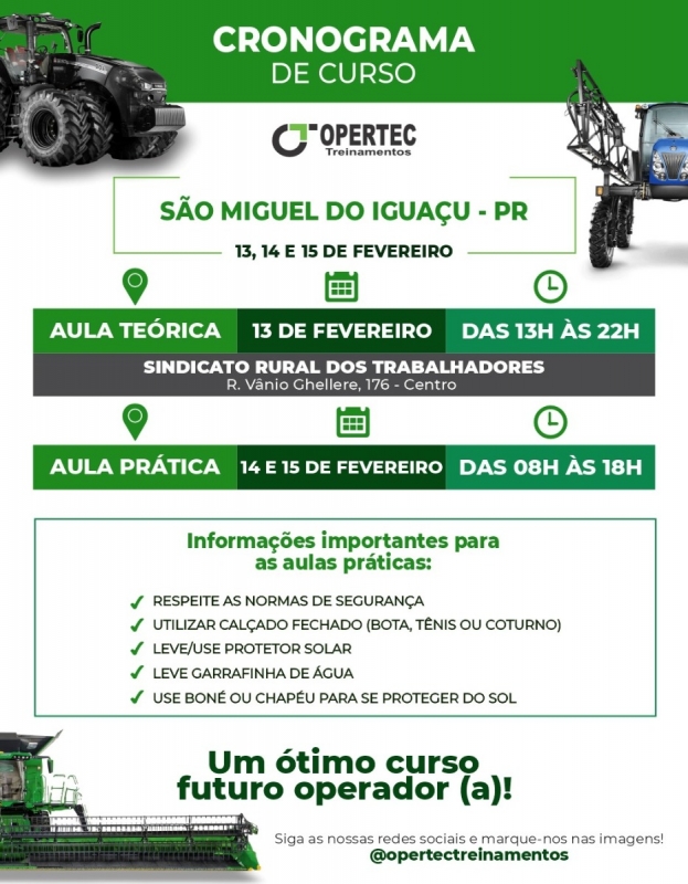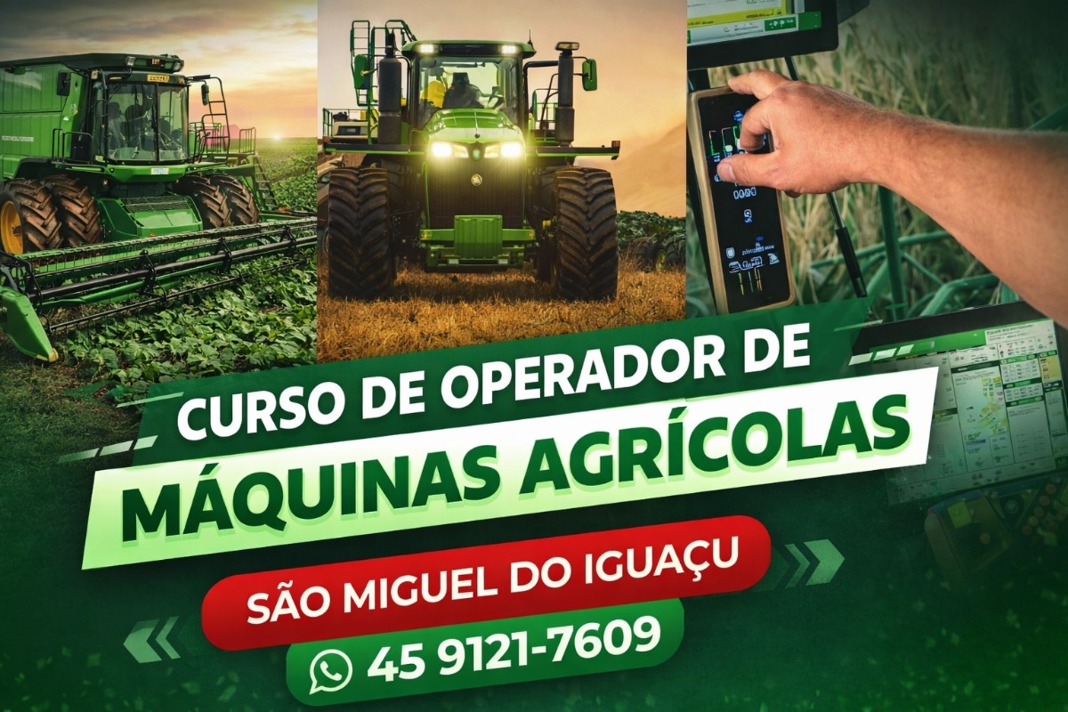 São Miguel do Iguaçu recebe, entre os dias 13, 14 e 15 de fevereiro, o Curso de Operador Master 2.0 de Máquinas Agrícolas e Treinamento de Melosa, promovido pela Opertec Treinamentos. A capacitação é voltada a profissionais e interessados em atuar ou se aperfeiçoar na operação de máquinas agrícolas modernas, acompanhando as exigências do agronegócio.