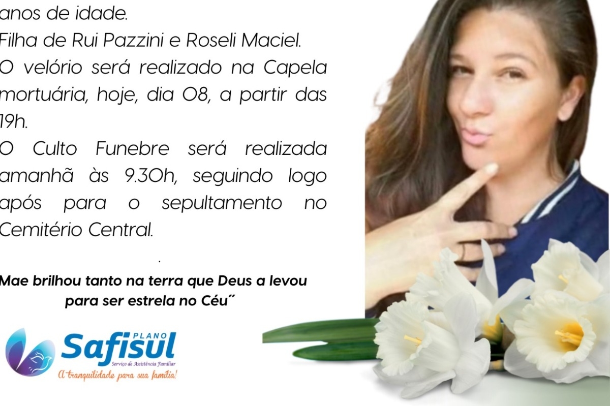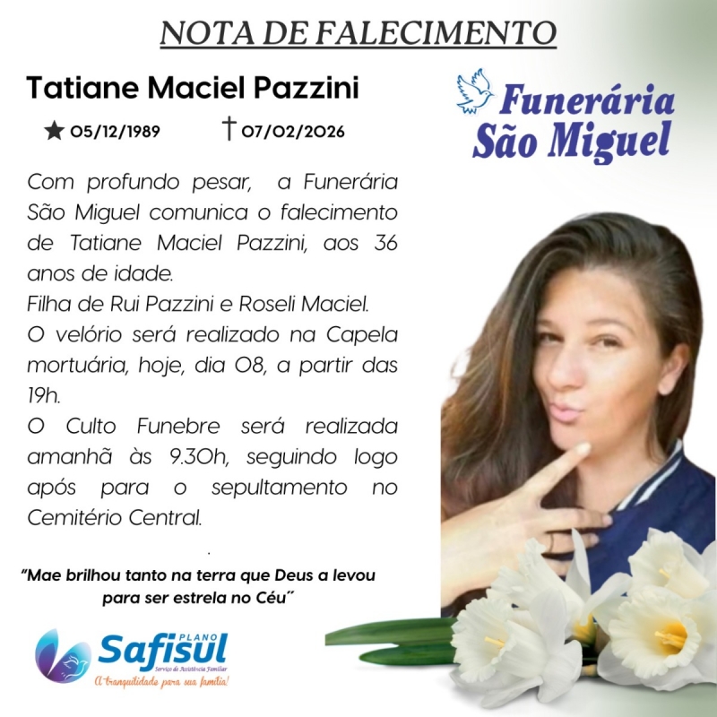 Com profundo pesar, a Funerária São Miguel comunica o falecimento de Tatiane Maciel Pazzini, ocorrido no dia 7 de fevereiro de 2026, aos 36 anos de idade. Tatiane nasceu em 5 de dezembro de 1989 e era filha de Rui Pazzini e Roseli Maciel.