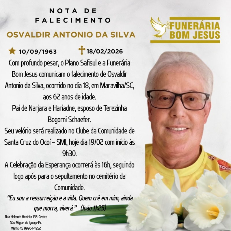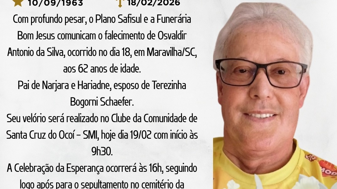Com profundo pesar, o Plano Safisul e a Funerária Bom Jesus comunicam o falecimento de Osvaldir Antonio da Silva, ocorrido na última terça-feira, 18 de fevereiro de 2026, em Maravilha (SC), aos 62 anos de idade.