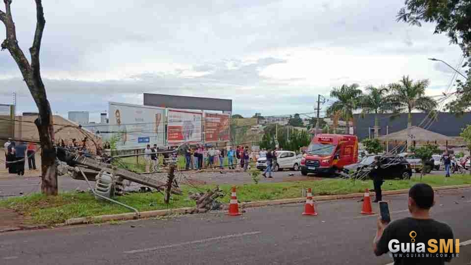 Violento acidente em Foz do Iguaçu derruba poste e lança motor de carro na avenida