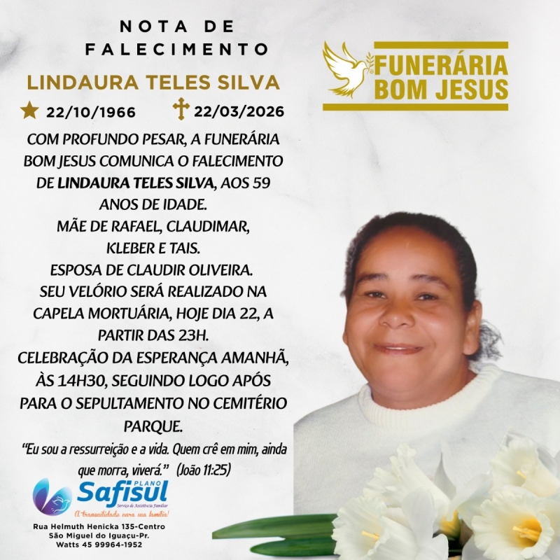 Com profundo pesar, a Funerária Bom Jesus comunica o falecimento de Lindaura Teles da Silva, ocorrido neste sábado, 22 de março de 2026, aos 59 anos de idade.