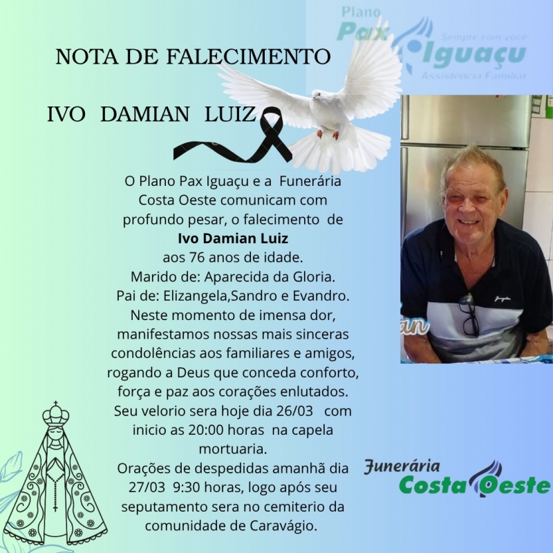 O Plano Pax Iguaçu e a Funerária Costa Oeste comunicam, com profundo pesar, o falecimento de Ivo Damian Luiz, aos 76 anos de idade.