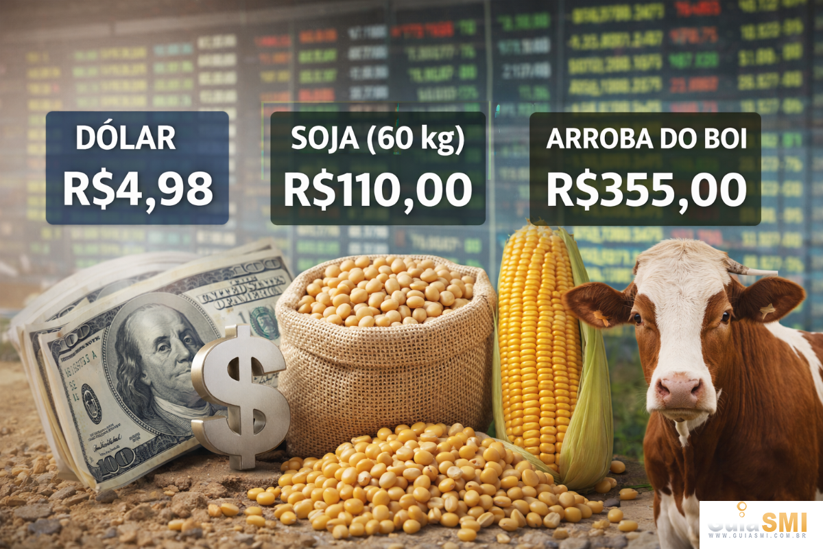 No setor agrícola, os preços dos grãos seguem sendo acompanhados de perto pelos produtores e investidores. A soja, negociada em reais por saca de 60 quilos, está cotada em R$ 110,00, enquanto o milho aparece com valor de R$ 52,00, mantendo-se dentro da média praticada nos últimos dias.