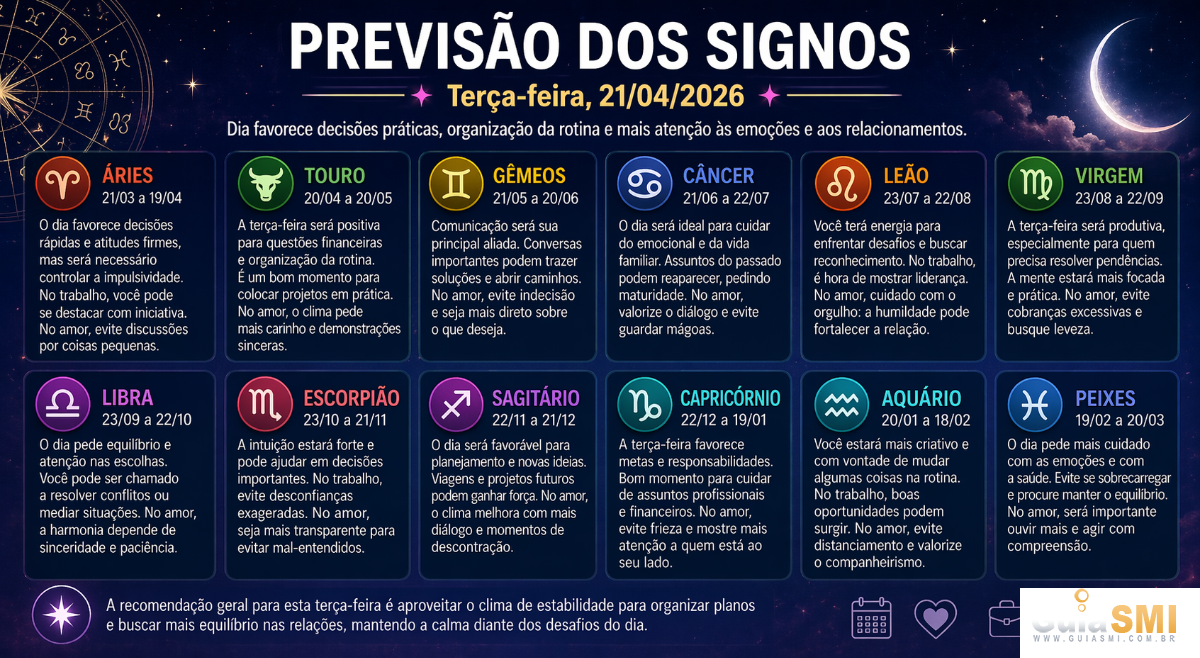 A recomendação geral para esta terça-feira é aproveitar o clima de estabilidade para organizar planos e buscar mais equilíbrio nas relações, mantendo a calma diante dos desafios do dia.