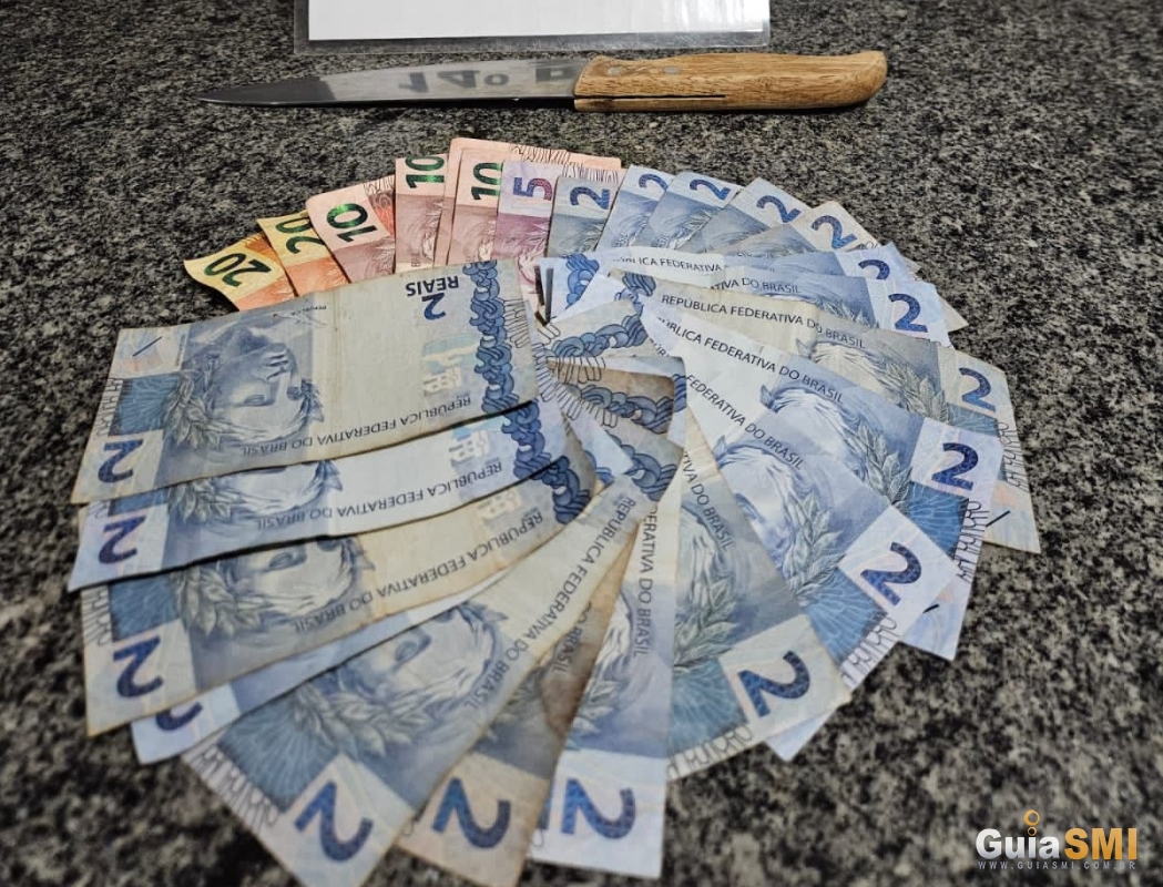 Diante da denúncia, os policiais realizaram a abordagem e, durante a revista pessoal, localizaram com o suspeito uma faca, além de uma quantia em dinheiro, que pode ser proveniente do roubo.