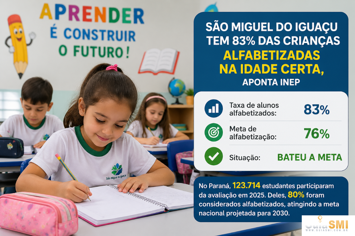 São Miguel do Iguaçu alcançou 83% de crianças alfabetizadas na idade certa, conforme dados divulgados pelo Instituto Nacional de Estudos e Pesquisas Educacionais Anísio Teixeira (Inep). O índice é resultado de uma avaliação aplicada a estudantes do final do 2º ano do Ensino Fundamental de escolas públicas, que têm em média 7 anos de idade.