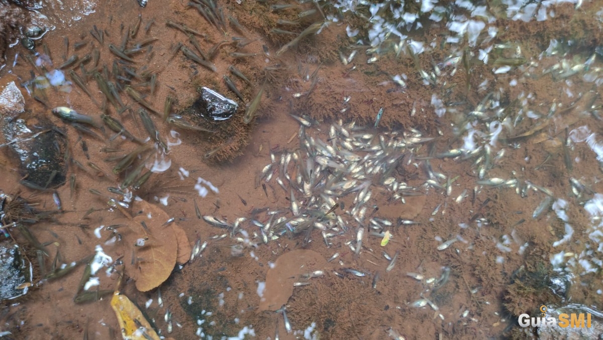 Água esbranquiçada, forte odor e grande quantidade de peixes mortos foram flagrados; Secretaria de Meio Ambiente coletou amostras para análise e investiga possível origem do lançamento