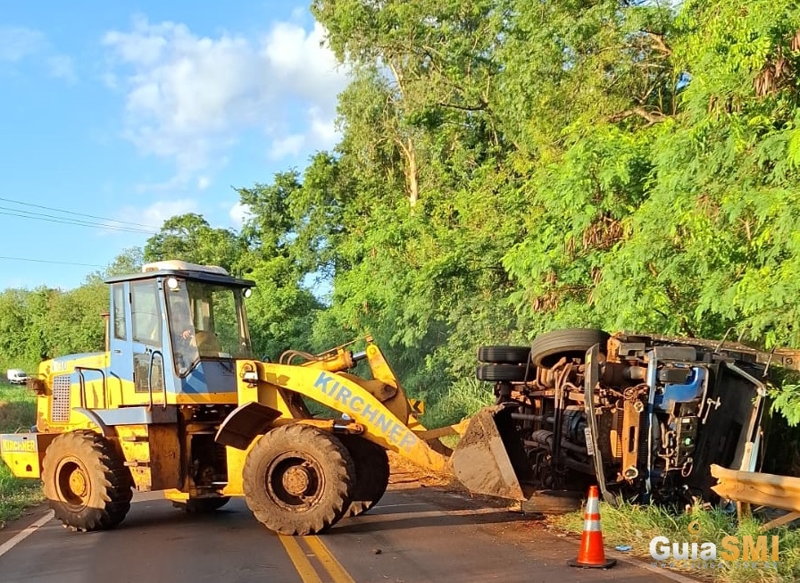 Acidente ocorreu sobre a ponte do Rio São Vicente e espalhou carga de milho, causando transtornos no trânsito